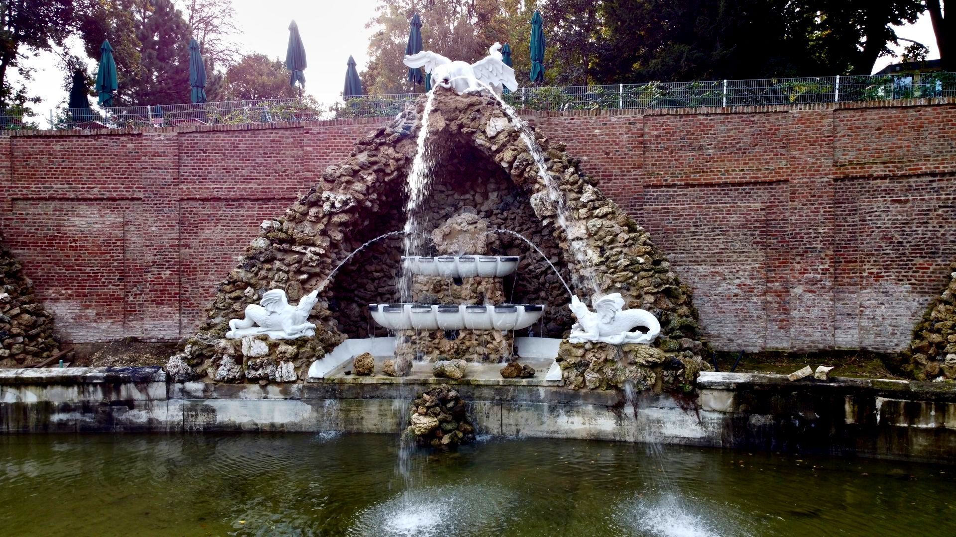Restaurierung von 2018 bis 2019 Jahren: Grotten, Drachenskulpturen/Wasserspeier, Muschelschalen, Bänke